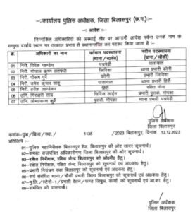 इसी कड़ी में आज न्यायधानी बिलासपुर में पुलिस अधीक्षक संतोष कुमार सिंह ने बड़ी संख्या में पुलिस कर्मचारियों के तबादले का आदेश और नामों की लिस्ट जारी की है, जिसमें निरीक्षक से लेकर आरक्षक तक के कर्मचारियों के नाम शामिल है इस आदेश में कई थाना प्रभारियों को भी इधर से उधर किया गया है