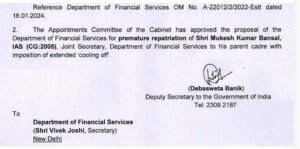 2005 बैच के IAS मुकेश बंसल अभी केंद्र में ज्वाइंट सेकरेट्री फाइनेंशियल सर्विस थे. अपाइंटमेंट कमेटी आफ कैबिनेट ने उन्हें मूल कैडर में लौटने की इजाजत दे दी है. बता दें कि बंसल साल 2020 में केंद्रीय प्रतिनियुक्ति पर गए थे. साल 2022 में वे ज्वाइंट सिकरेट्री इंपैनल हुए थे.