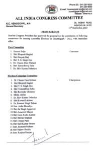 कांग्रेस ने 4 समितियों का किया गठन, कोर कमेटी में कुमारी सैलजा, CM भूपेश समेत कई मंत्री, डॉ. चरण दास महंत बने चुनाव अभियान समिति के अध्यक्ष