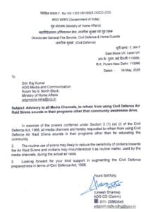गृह मंत्रालय के नागरिक सुरक्षा निदेशालय ने सभी मीडिया चैनलों को सख्त निर्देश जारी किए हैं कि वे “सिविल डिफेंस एयर रेड सायरन” की ध्वनि का प्रयोग न्यूज या मनोरंजन के कार्यक्रमों में नहीं करे।