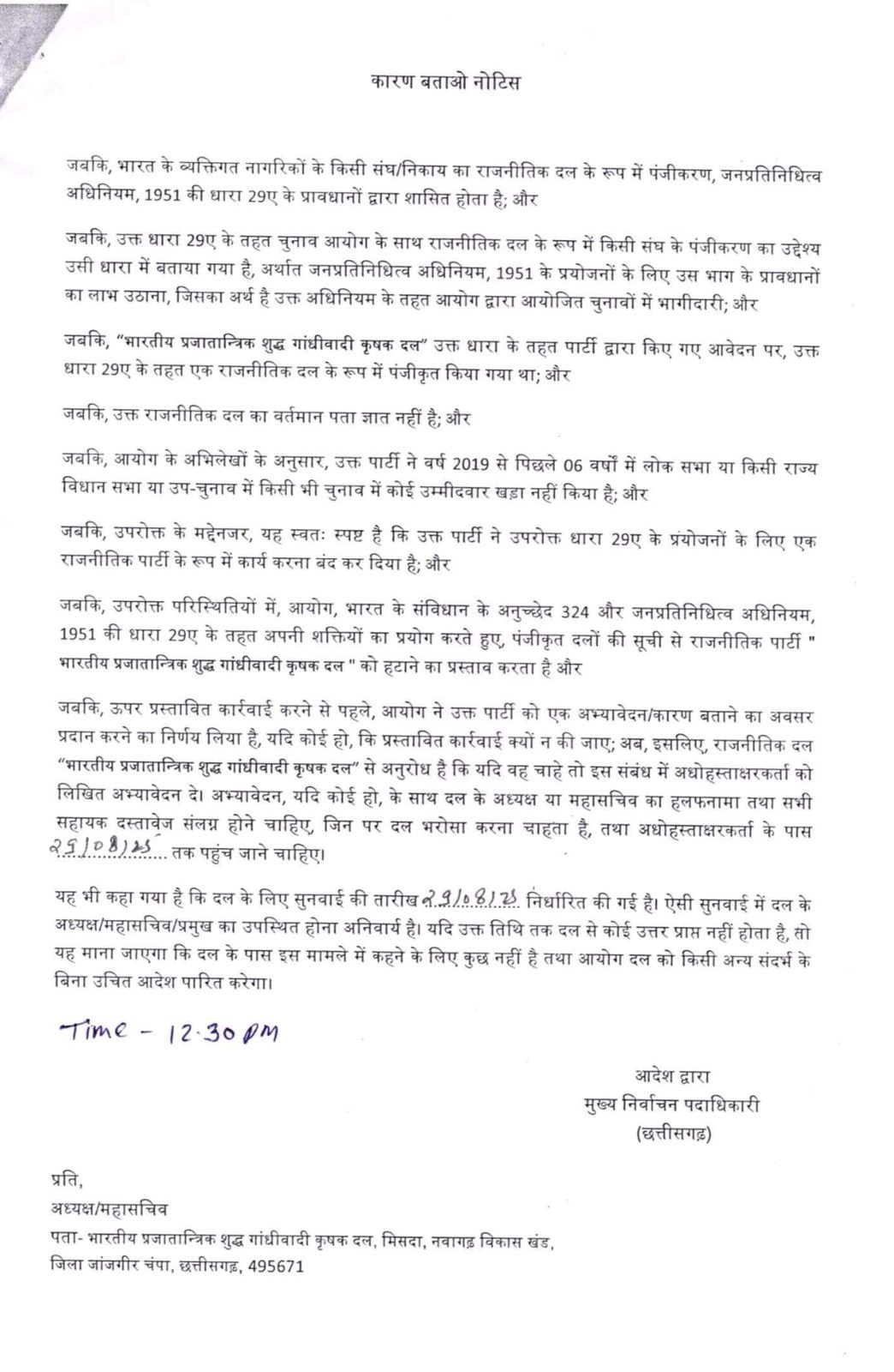 मुख्य निर्वाचन पदाधिकारी ने अध्यक्ष, भारतीय प्रजातान्त्रिक शुद्ध गांधीवादी कृषक दल को जारी किया गया कारण बताओ नोटिस