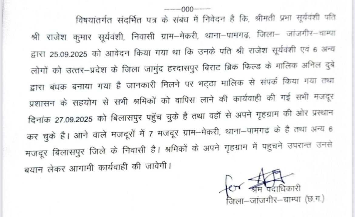 सभी श्रमिक 27 सितम्बर को बिलासपुर पहुंच चुके हैं और वहां से अपने-अपने गृहग्राम के लिए रवाना हो गए हैं। श्रमिकों के सुरक्षित घर पहुंचने के बाद उनके बयान लेकर आगे की कार्रवाई की जाएगी।