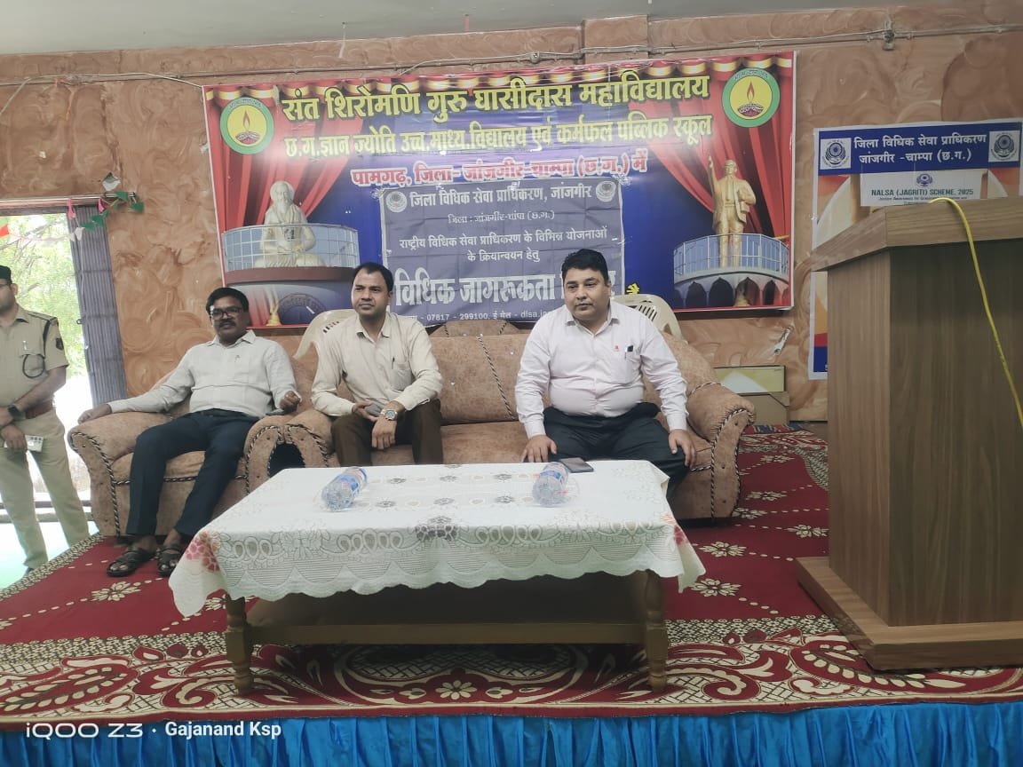 पामगढ़, 12 अक्टूबर 25। छत्तीसगढ़ ज्ञान ज्योति उच्चतर माध्यमिक विद्यालय पामगढ़ में आज विधिक जागरूकता शिविर का आयोजन किया गया। कार्यक्रम में मुख्य अतिथि के रूप में श्री गणेश राम पटेल, द्वितीय जिला एवं अपर सत्र न्यायाधीश, जांजगीर-चांपा उपस्थित रहे।