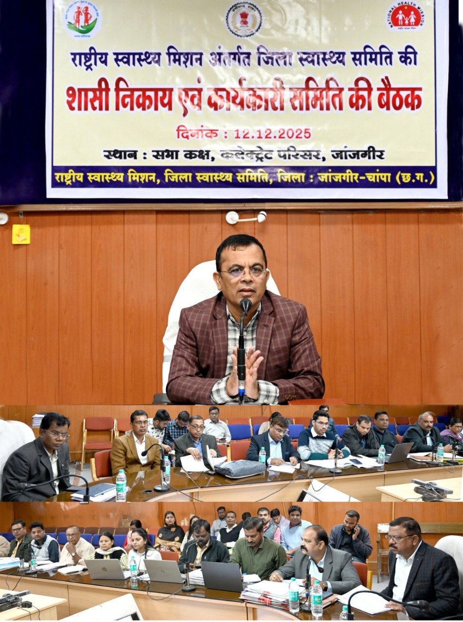 जांजगीर-चांपा, 12 दिसम्बर 2025। कलेक्टर श्री जन्मेजय महोबे की अध्यक्षता में राष्ट्रीय स्वास्थ्य मिशन अंतर्गत जिला स्वास्थ्य समिति की शासी एवं कार्यकारी समिति की बैठक कलेक्टोरेट सभाकक्ष में सम्पन्न हुई। बैठक में जिले में संचालित स्वास्थ्य योजनाओं, टीकाकरण कार्यक्रम, मातृ-शिशु स्वास्थ्य सेवाओं, कुपोषण उन्मूलन, स्वास्थ्य संस्थाओं की उपलब्धियों एवं चुनौतियों तथा आगामी कार्ययोजना पर विस्तृत चर्चा की गई। कलेक्टर श्री महोबे ने सभी जनस्वास्थ्य कार्यक्रमों को प्रभावी ढंग से क्रियान्वित करने के निर्देश दिए। स्वास्थ्य सेवाओं की गुणवत्ता एवं सतत सुधार विभाग की सर्वाेच्च प्राथमिकता हो।