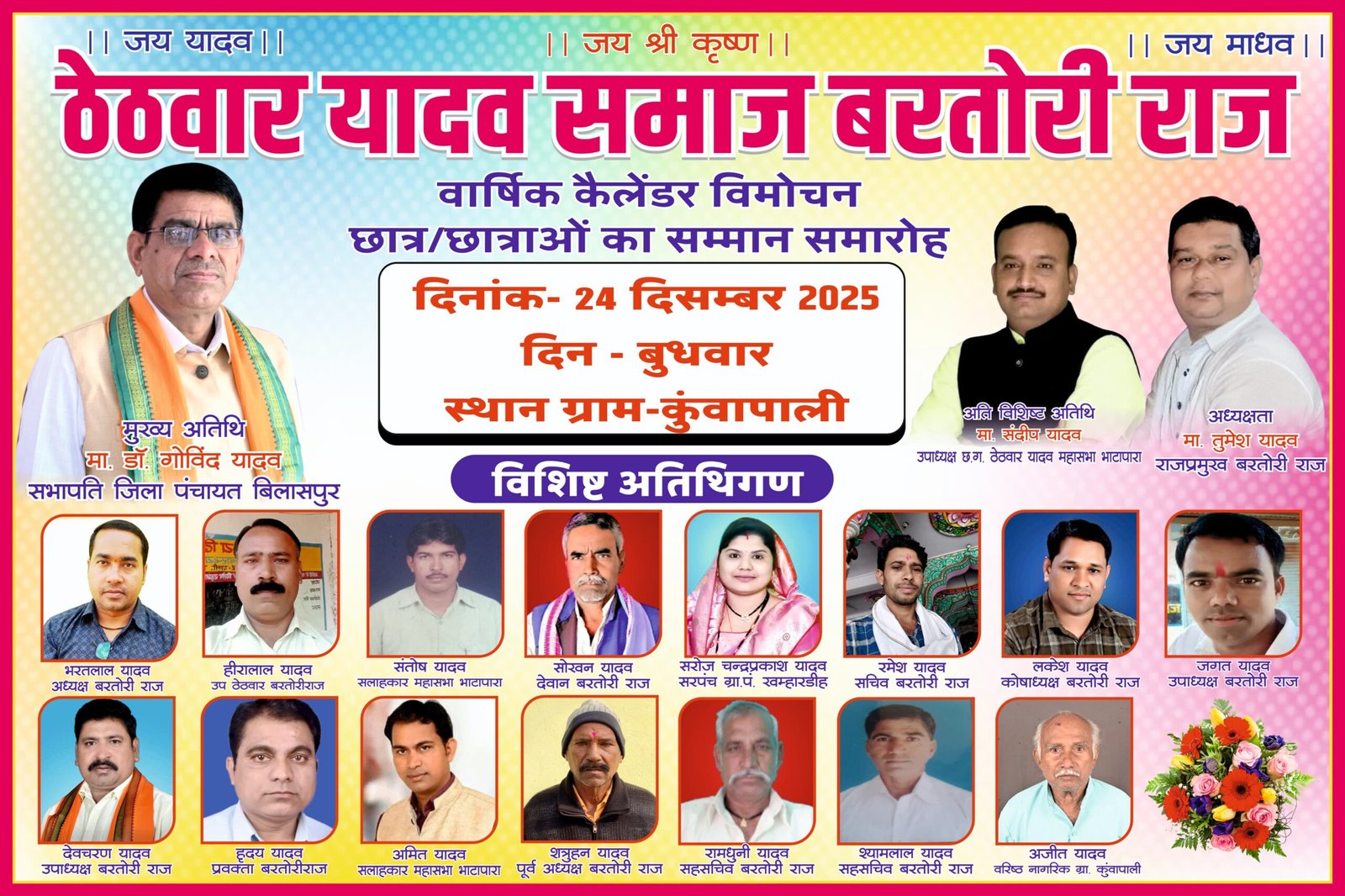 पामगढ़, 22 दिसंबर 2025। ठेठवार यादव समाज बरतोरी राज के तत्वावधान में वार्षिक कैलेंडर विमोचन एवं प्रतिभावान छात्र-छात्राओं का सम्मान समारोह आगामी 24 दिसंबर 2025 (बुधवार) को ग्राम कुँवापाली, ग्राम पंचायत खम्हारडीह में भव्य रूप से आयोजित किया जाएगा। यह एक दिवसीय सामाजिक सम्मेलन समाज की एकता, शिक्षा, संस्कृति और नवचेतना को सशक्त बनाने के उद्देश्य से आयोजित किया जा रहा है।