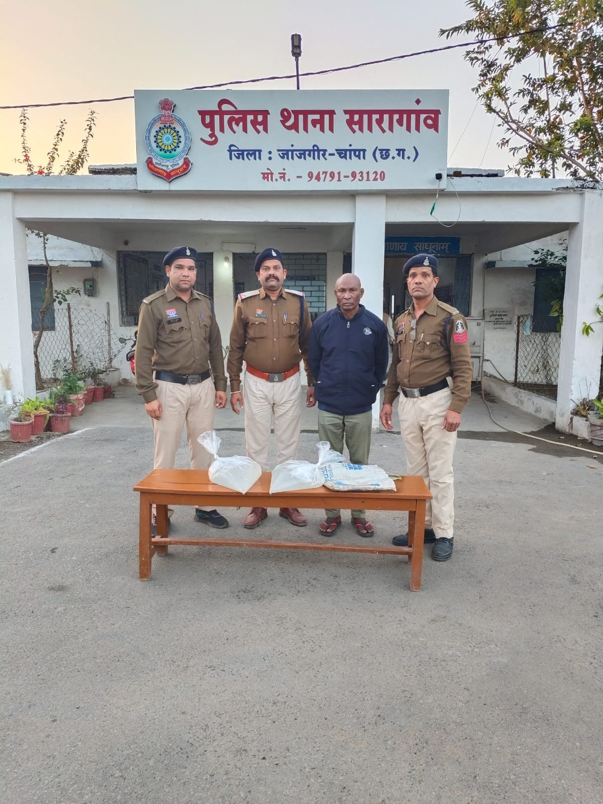 जांजगीर चांपा, 7 जनवरी 26। पुलिस अधीक्षक जांजगीर चांपा श्री विजय कुमार पाण्डेय (IPS) के निर्देशन में जिले में अवैध शराब बिक्री पर अंकुश लाने के लिए जिला पुलिस जांजगीर द्वारा लगातार कार्रवाई की जा रही है इसी क्रम में थाना सारागांव पुलिस द्वारा अवैध शराब बिक्री करने वाले के विरुद्ध रेड कार्यवाही कर आरोपी धना राम यादव को घेराबंदी कर पकड़ा जिसके कब्जे से अवैध कच्ची महुआ शराब बरामद किया जाकर आरोपी के विरुद्ध आबकारी एक्ट के तहत अपराध पंजीबद्ध कर विधिवत गिरफ्तार कर न्यायिक रिमाण्ड पर भेजा गया है।