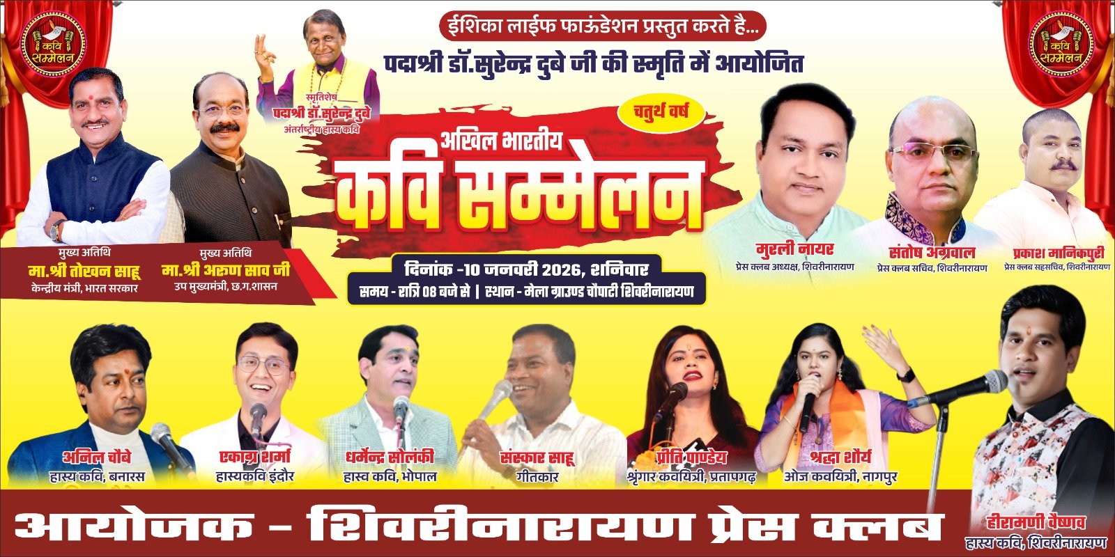 शिवरीनारायण, 8 जनवरी 26। अंतरराष्ट्रीय ख्याति प्राप्त हास्य कवि, प्रखर व्यंग्यकार एवं पद्मश्री सम्मानित डॉ. सुरेंद्र दुबे की पुण्य स्मृति में 10 जनवरी 2026, शनिवार को शिवरीनारायण के मेला ग्राउंड चौपाटी में भव्य अखिल भारतीय हास्य कवि सम्मेलन का आयोजन किया जा रहा है। यह आयोजन ईशिका लाइफ फाउंडेशन एवं शिवरीनारायण प्रेस क्लब के संयुक्त तत्वावधान में होगा।