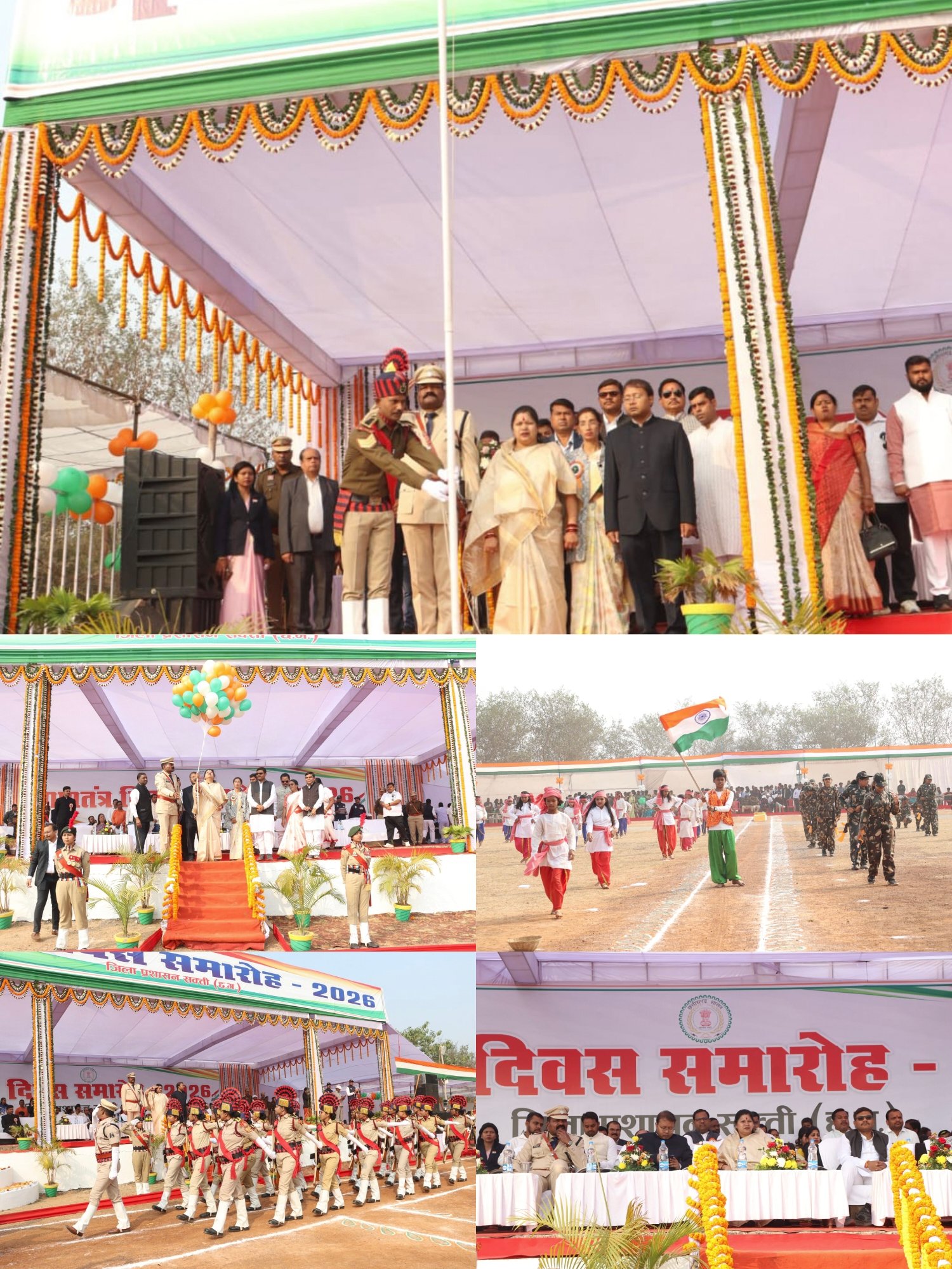 सक्ती 26 जनवरी 2026/ जिला मुख्यालय सक्ती में 77वां गणतंत्र दिवस समारोह देशभक्ति की भावना और हर्षोल्लास के साथ उत्साहपूर्वक मनाया गया। गणतंत्र दिवस का मुख्य समारोह कलेक्टर कार्यालय के निकट ग्राउंड में गरिमामय और भव्य रूप से आयोजित हुआ। जिसमें मुख्य अतिथि सांसद लोकसभा क्षेत्र जांजगीर चांपा श्रीमती कमलेश जांगड़े ने ध्वजारोहण कर परेड की सलामी ली और मुख्यमंत्री का जनता के नाम प्रेषित संदेश का वाचन किया। जिला स्तरीय कार्यक्रम में विभागीय योजनाओं पर आधारित झाकी प्रदर्शनी से गणतंत्र दिवस समारोह में आए लोगो को योजनाओ की भौतिक रूप से भी जानकारी मिली। इस अवसर पर कार्यक्रम स्थल में विभिन्न स्कूली बच्चों द्वारा शानदार सामूहिक सांस्कृतिक कार्यक्रम की मनमोहक प्रस्तुति दी गई। साथ ही स्वतंत्रता संग्राम सेनानियों, शहीद के परिजनों और मीसाबंदियो को भी सम्मानित किया गया व विभिन्न शासकिय विभागों में उल्लेखनीय कार्य करने वाले अधिकारियों व कर्मचारियों को प्रशस्ति पत्र देकर सम्मानित किया गया।