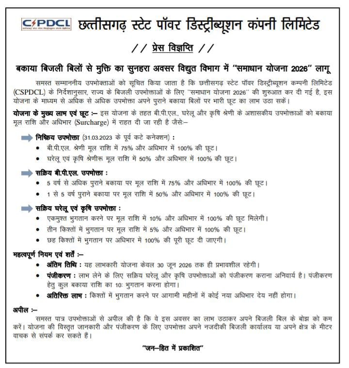 जांजगीर-चांपा 12 मार्च 2026। छत्तीसगढ़ स्टेट पॉवर डिस्ट्रीब्यूशन कम्पनी लिमिटेड (CSPDCL) के निर्देशानुसार, राज्य के बिजली उपभोक्ताओं के लिए समाधान योजना 2026″ की शुरुआत कर दी गई है। इस योजना के माध्यम से अधिक से अधिक उपभोक्ता अपने पुराने बकाया बिलों पर भारी छूट का लाभ उठा सकें। योजना के मुख्य लाभ एवं छूट इस योजना के तहत बी.पी.एल. घरेलू और कृषि श्रेणी के अशासकीय उपभोक्ताओं को बकाया मूल राशि और अधिभार (Surcharge) में राहत दी जा रही है।