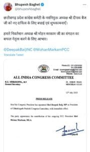 रायपुर :- अखिल भारतीय राष्ट्रीय कांग्रेस ने सांसद दीपक बैज को छत्तीसगढ़ प्रदेश कांग्रेस कमेटी का अध्यक्ष नियुक्त किया है. सीएम भूपेश बघेल ने छत्तीसगढ़ प्रदेश कांग्रेस कमेटी के नवनियुक्त अध्यक्ष दीपक बैज को नए दायित्व के लिए बधाई एवं शुभकामनाएं दी है. सीएम बघेल ने ट्वीट कर निवर्तमान अध्यक्ष मोहन मरकाम का संगठन का सफल नेतृत्व करने के लिए आभार जताया है।
