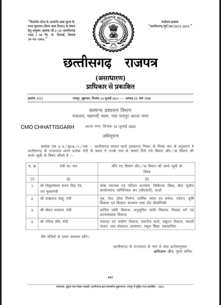कैबिनेट फेरबदल का नोटिफिकेशन जारी :TS सिंहदेव, रविंद्र चौबे सहित इन मंत्रियों के विभाग में हुआ फेरबदल, पढ़िए राजपत्र में क्या लिखा है.