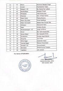 रायपुर :- कांग्रेस ने प्रत्याशियों की दूसरी सूची जारी कर दी है. इस सूची में 53 प्रत्याशियों के नाम हैं. केवल 7 प्रत्य़ाशियों का नाम आना बाकी है. इससे पहले कांग्रेस ने पहली सूची में 30 प्रत्याशियों की लिस्ट जारी की थी, जिसमें 8 विधायकों का टिकट काटा गया था