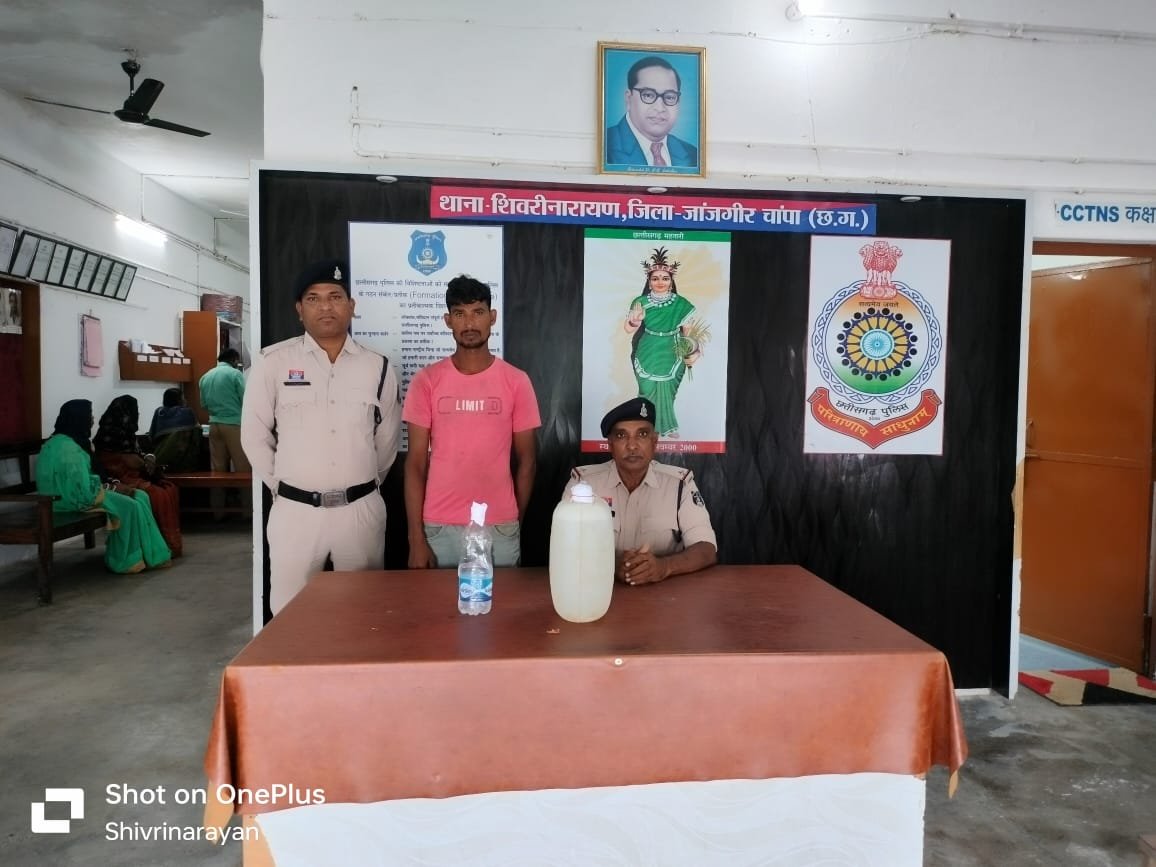 जांजगीर चांपा :- पुलिस अधीक्षक जांजगीर चांपा श्री विजय कुमार पाण्डेय (IPS)* के निर्देशन में एवं *अतिरिक्त पुलिस अधीक्षक श्री उमेश कुमार कश्यप* के कुशल मार्ग दर्शन में जिला पुलिस जांजगीर द्वारा अवैध शराब बिक्री पर अंकुश लगाने के लिए लगातार कार्रवाई की जा रही है। इसी कड़ी में एसडीओपी चांपा श्री यदुमणी सिदार के नेतृत्व में मुखबिर सूचना पर थाना शिवरीनारायण पुलिस द्वारा *आरोपी* प्रहलाद कश्यप के कब्जे से 10.700 लीटर अवैध कच्ची महुआ शराब कीमती 1500/रूपये को बरामद किया जाकर आरोपी के विरुद्ध अपराध/धारा 34 (2) आबकारी एक्ट पंजीबद्ध कर विधिवत गिरफ्तार कर न्यायिक रिमांड पर भेजा गया।